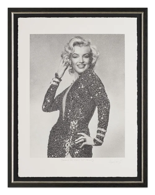 Claridge’s The Diamond Dust Collection represents Marilyn in symbolic black and white, enveloped in what has now become his trademark ‘diamond dust’ as a nod to the glamour and opulence of Hollywood. Simon has used the glittering diamond dust on each image to ensure the works portray something of the aura of Marilyn and the luminescence of her being under the spotlight.
